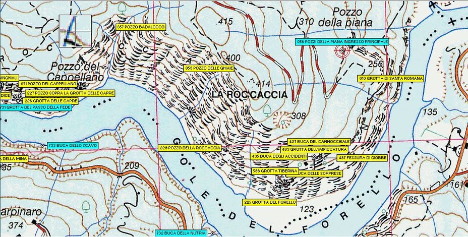 Sulla base di un programma informatico opportuno sono state geolocalizzate tutte le cavità accatastate, sia sulla cartografia IGM al 25.000 che sulle Carte Tecniche Regionali al 10.000, collegandole ai rispettivi rilievi (se esistenti).