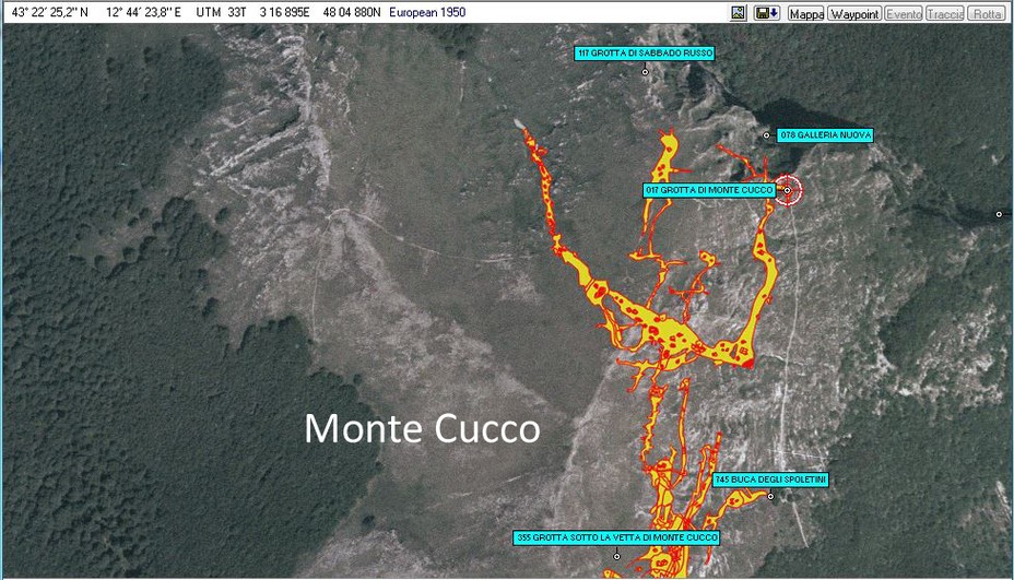 Monte Cucco - Posizionamento delle grotte, con proiezione all'esterno del sistema carsico sotterraneo, su foto aerea 1:10000 georeferenziata